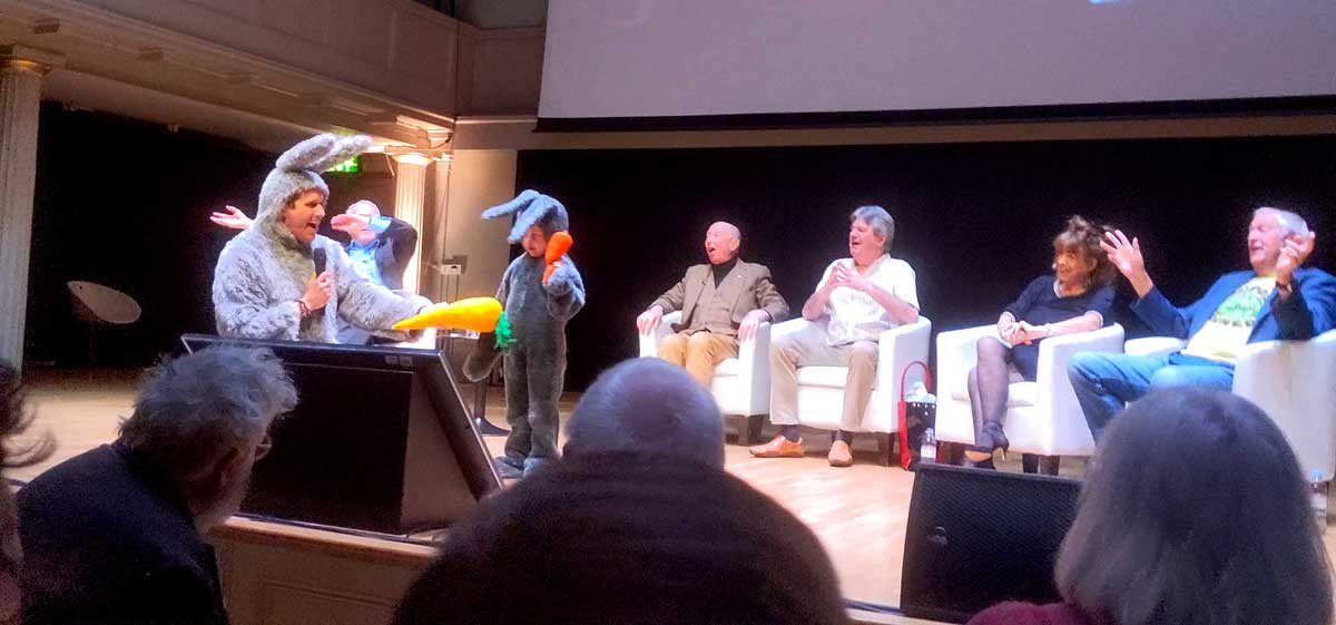 Matthew Butler’s rendition of Bright Eyes hits the big screen, and by the chorus, the house lights are back on as the man himself walks on in an adult-sized bunny costume, but (and this is one thing I never knew was going to happen) accompanied by his daughter wearing his actual costume from back in the day. After all, he was five and now his child has hit that age, so it’s a case of passing on the baton, or felt carrot, shall we say.